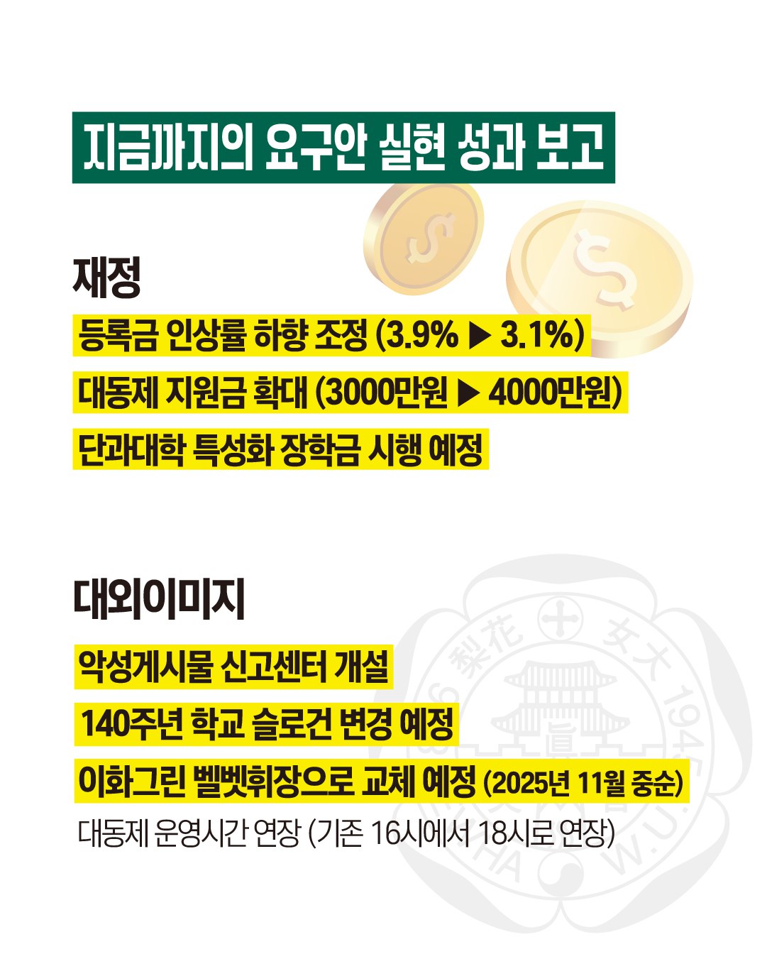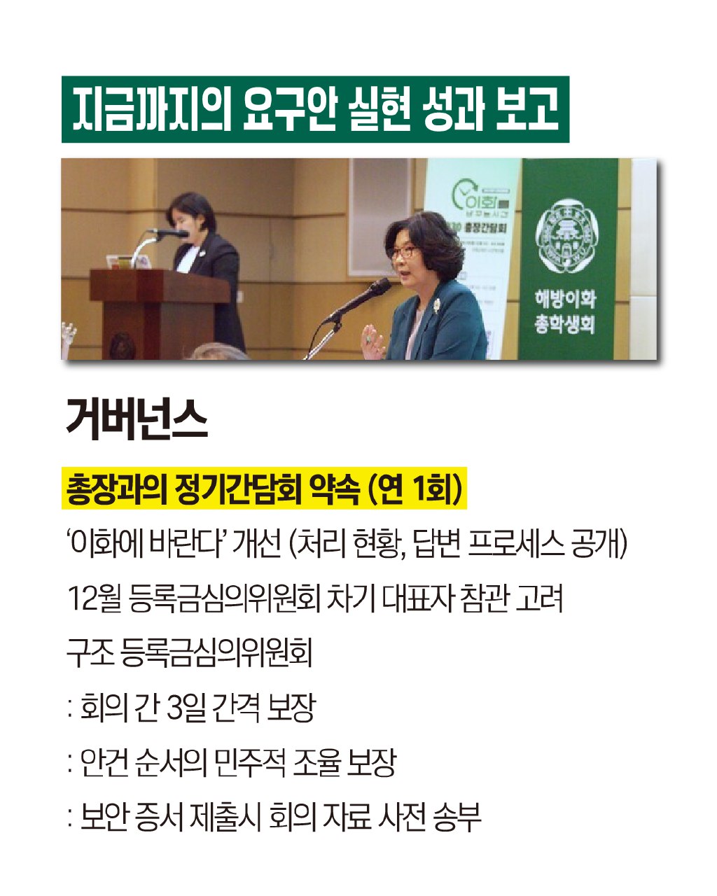 ๊ฐ๋จ์์ ๋ง์ดํฌ๋ฅผ ๋ค๊ณ ๋งํ๋ ์ดํ์ฌ์๋ํ๊ต ์ด์ฅ์ด ๋ณด์ด๊ณ , ์์๋ ์ฌํ๋ฅผ ๋ณด๋ ์ดํ์ํ์ฅ์ด ๋ณด์ธ๋ค. ์๋จ์๋ ‘์ง๊ธ๊น์ง์ ์๊ตฌ์ ์คํ ์ฑ๊ณผ ๋ณด๊ณ ’ ๋ฌธ๊ตฌ๊ฐ ์์ผ๋ฉฐ, ์๋์๋ ‘๊ฑฐ๋ฒ๋์ค ์ด์ฅ๊ณผ์ ์ ๊ธฐ๊ฐ๋ดํ ์ฝ์(์ฐ 1ํ)’ ๋ฑ ์ดํ์ํ์ ์ฑ๊ณผ ๋ด์ฉ์ด ์ ํ ์๋ค.