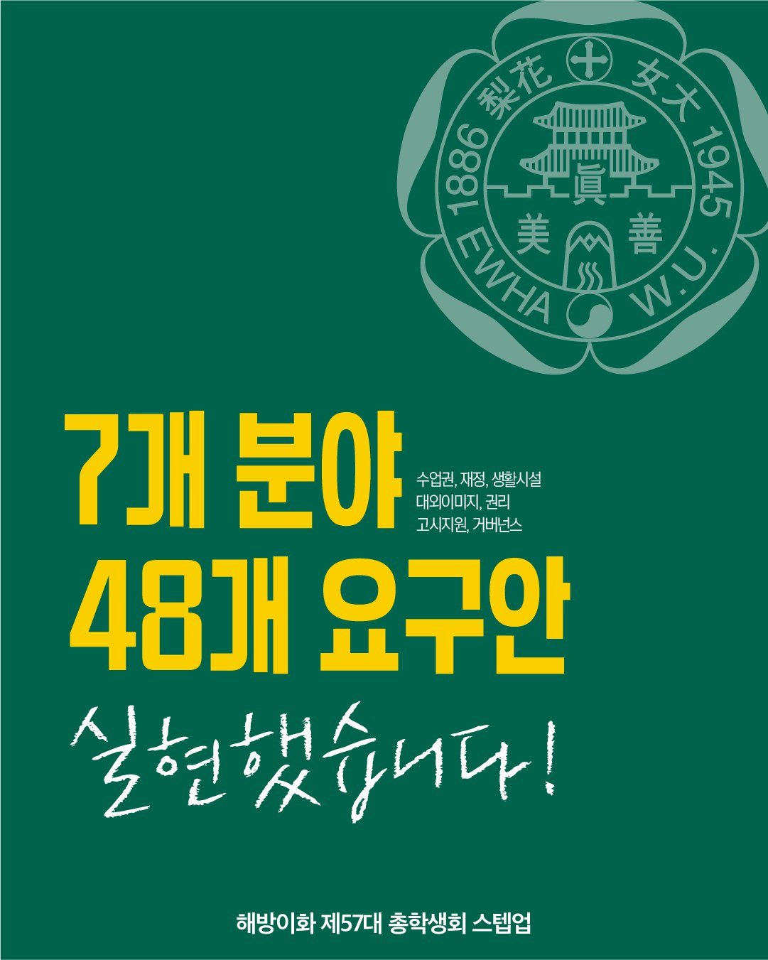๋ น์ ๋ฐํ์ ์ดํ์ฌ์๋ํ๊ต ๊ตํ๊ฐ ๋ฐฐ๊ฒฝ์ผ๋ก ํฌ๋ฏธํ๊ฒ ๋ณด์ด๊ณ , ์ค์์ ๋ ธ๋ ๊ธ์จ๋ก ‘7๊ฐ ๋ถ์ผ 48๊ฐ ์๊ตฌ์ ์คํํ์ต๋๋ค!’๋ผ๊ณ ์ ํ ์๋ค. ํ๋จ์๋ ํฐ ๊ธ์จ๋ก ‘ํด๋ฐฉ์ดํ ์ 57๋ ์ดํ์ํ ์คํ ์ ’์ด๋ผ๊ณ ์ฐ์ฌ ์๋ค.