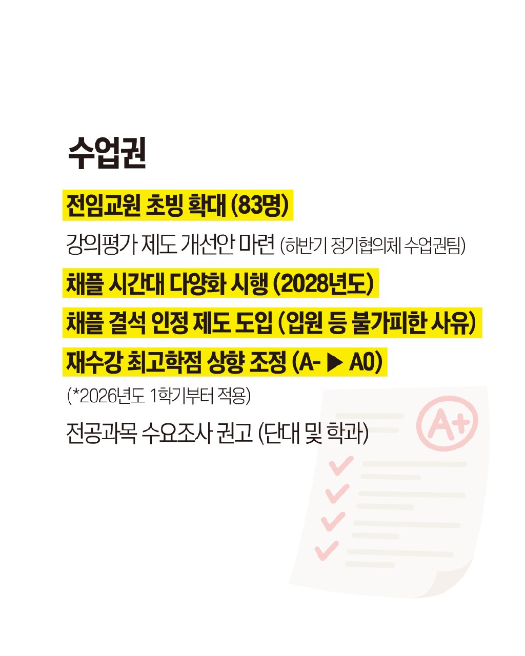 ธ๋์ ๊ฐ์กฐ๋ก ์ ๋ฆฌ๋์ด ์๋ค. ์ค๋ฅธ์ชฝ์๋ A+ ํ์๊ฐ ์๋ ์ฒดํฌ๋ฆฌ์คํธ ๊ทธ๋ฆผ์ด ์๋ค.