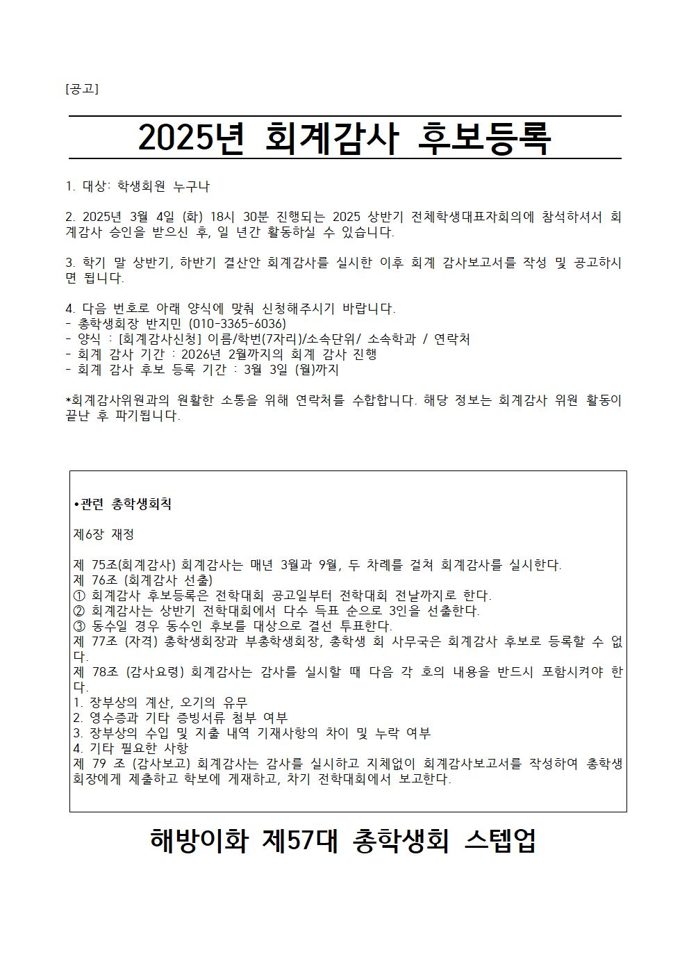 2. 2025년 3월 4일 (화) 18시 30분 진행되는 2025 상반기 전체학생대표자회의에 참석하셔서 회계감사 승인을 받으신 후, 일 년간 활동하실 수 있습니다.