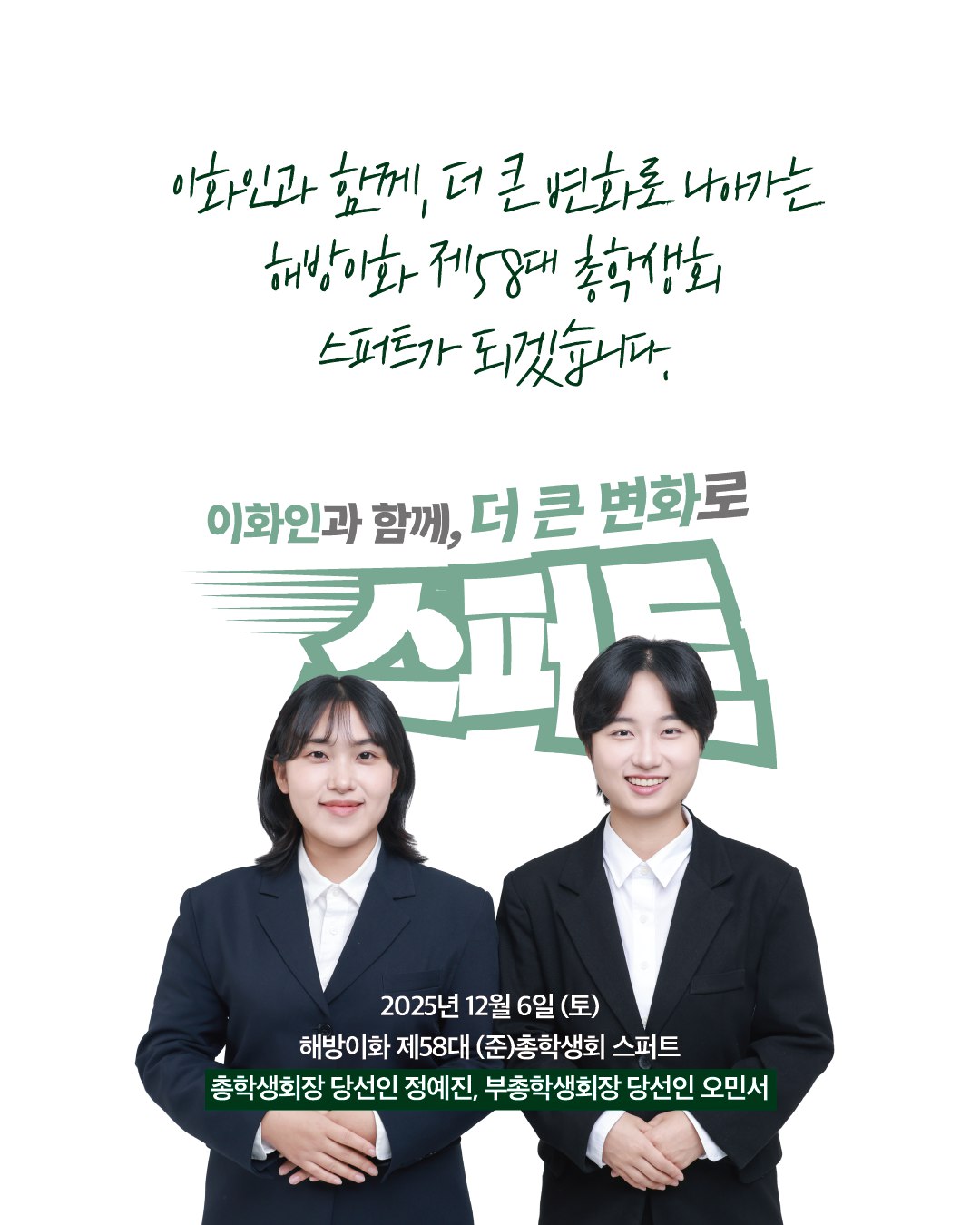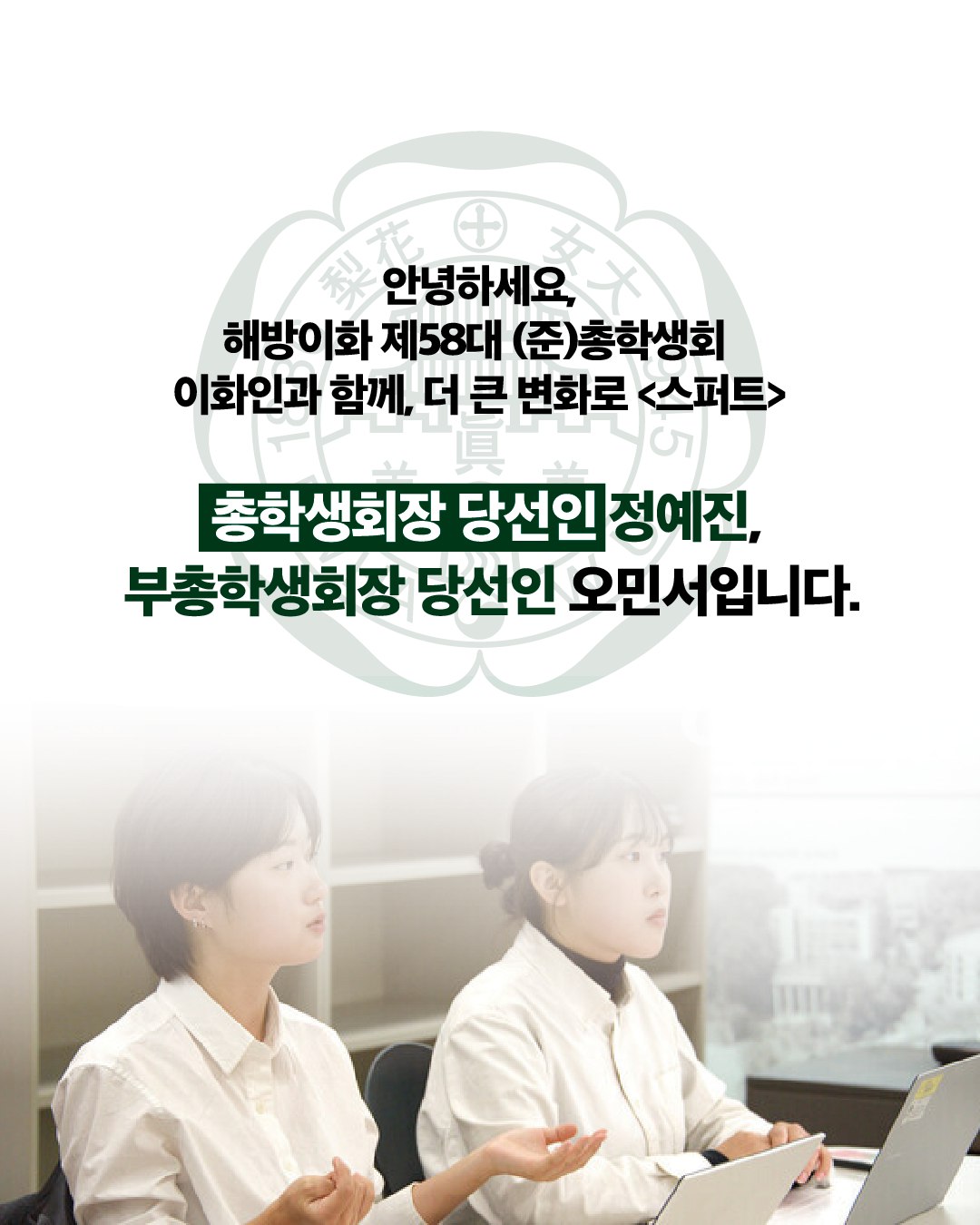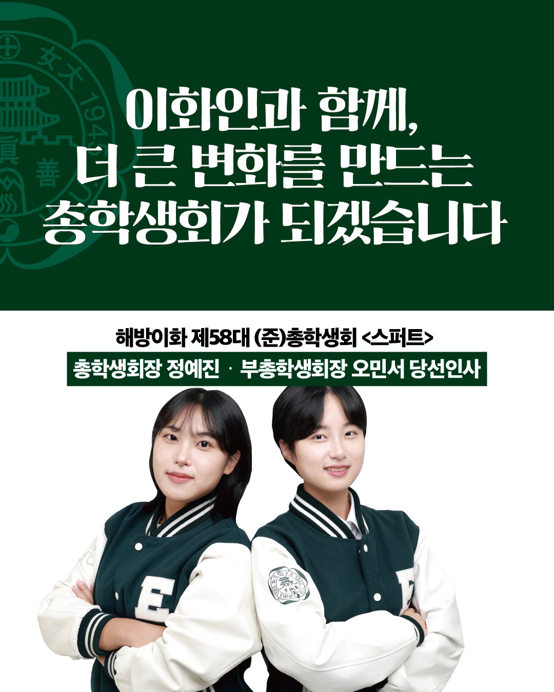 안녕하세요, 해방이화 제58대 (준)총학생회 ‘이화인과 함께, 더 큰 변화로 <스퍼트>’의 총학생회장 당선인 정예진, 부총학생회장 당선인 오민서입니다.
