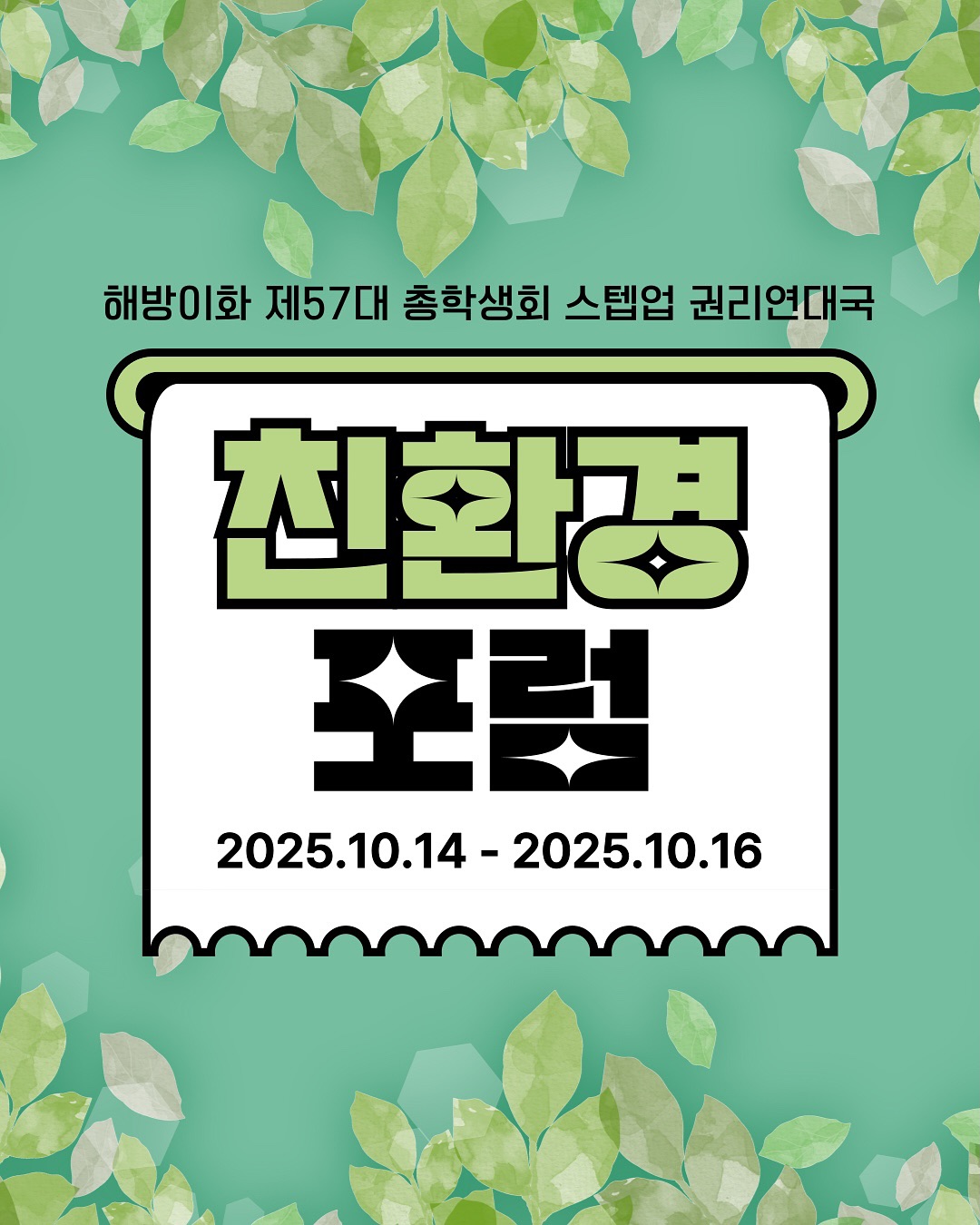 안녕하세요. 해방이화 제57대 총학생회 스텝업 권리연대국입니다! 2025 제7회 권리문화축제 Right Light Festival에서 권리연대국이 친환경 포럼과 부스를 개최합니다!