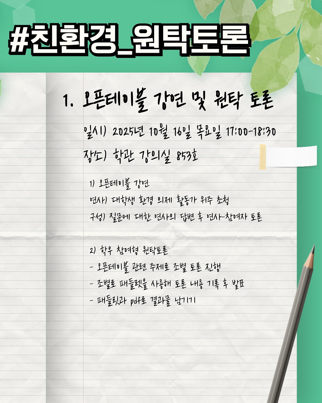 친환경 포럼은 오픈테이블 강연과 원탁 토론으로 진행됩니다! 대학생 환경 의제 활동가를 초청하여 강연을 듣고 질문을 나누는 시간을 가진 뒤, 참여자들과 함께 조별로 토론을 진행하게 됩니다! 마지막에는 조별로 나눈 이야기를 발표하는 시간도 있습니다.