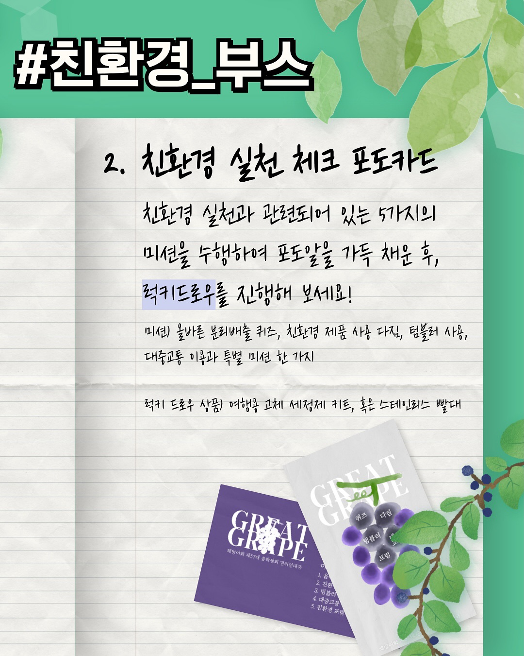 친환경 부스에서는 친환경 실천 체크 포도카드를 드립니다. 5개 포도알에 모두 참 잘했어요! 완료 스티커를 붙이면 럭키드로우를 진행하실 수 있습니다.